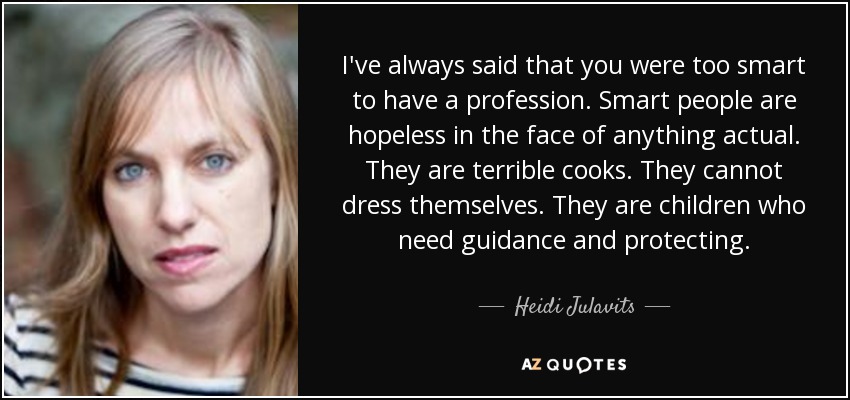 I've always said that you were too smart to have a profession. Smart people are hopeless in the face of anything actual. They are terrible cooks. They cannot dress themselves. They are children who need guidance and protecting.