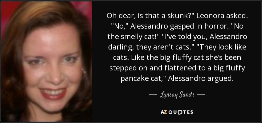 Oh dear, is that a skunk?" Leonora asked. "No," Alessandro gasped in horror. "No the smelly cat!" "I've told you, Alessandro darling, they aren't cats." "They look like cats. Like the big fluffy cat she's been stepped on and flattened to a big fluffy pancake cat," Alessandro argued.