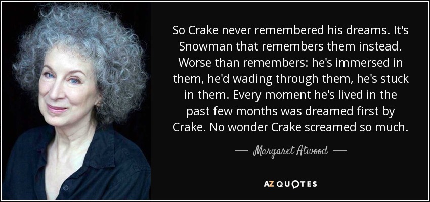 So Crake never remembered his dreams. It's Snowman that remembers them instead. Worse than remembers: he's immersed in them, he'd wading through them, he's stuck in them. Every moment he's lived in the past few months was dreamed first by Crake. No wonder Crake screamed so much.