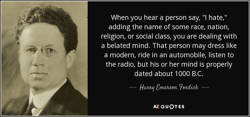 When you hear a person say, "I hate," adding the name of some race, nation, religion, or social class, you are dealing with a belated mind. That person may dress like a modern, ride in an automobile, listen to the radio, but his or her mind is properly dated about 1000 B.C.