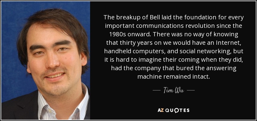 The breakup of Bell laid the foundation for every important communications revolution since the 1980s onward. There was no way of knowing that thirty years on we would have an Internet, handheld computers, and social networking, but it is hard to imagine their coming when they did, had the company that bured the answering machine remained intact.