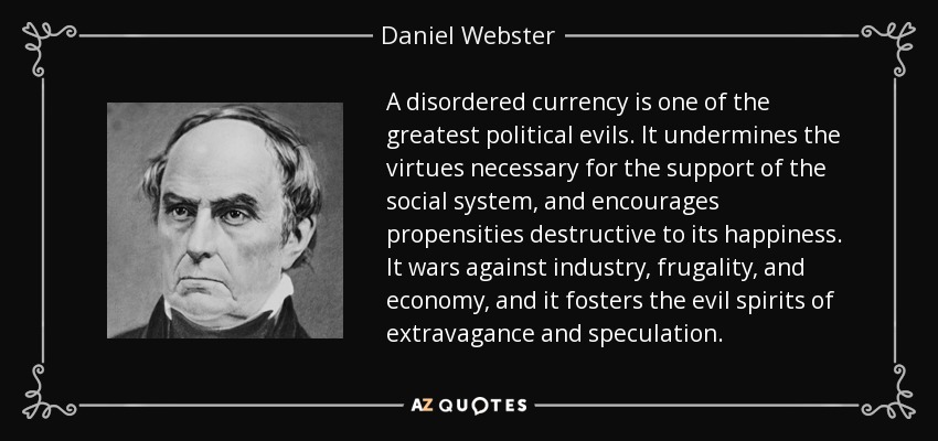 A disordered currency is one of the greatest political evils. It undermines the virtues necessary for the support of the social system, and encourages propensities destructive to its happiness. It wars against industry, frugality, and economy, and it fosters the evil spirits of extravagance and speculation.