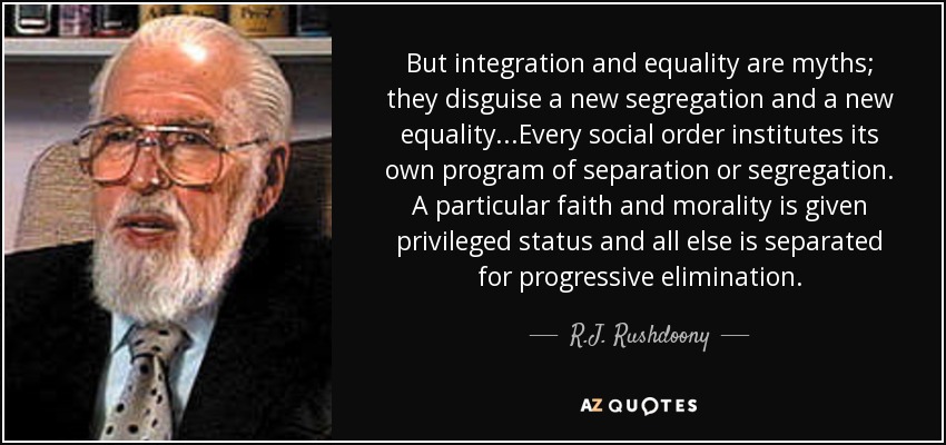 But integration and equality are myths; they disguise a new segregation and a new equality...Every social order institutes its own program of separation or segregation. A particular faith and morality is given privileged status and all else is separated for progressive elimination.