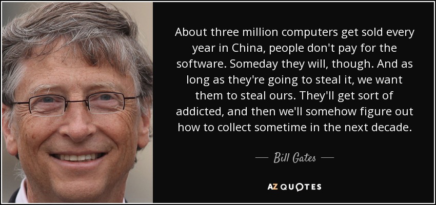 About three million computers get sold every year in China, people don't pay for the software. Someday they will, though. And as long as they're going to steal it, we want them to steal ours. They'll get sort of addicted, and then we'll somehow figure out how to collect sometime in the next decade.