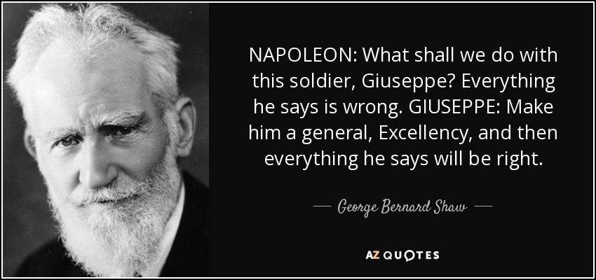 NAPOLEON: What shall we do with this soldier, Giuseppe? Everything he says is wrong. GIUSEPPE: Make him a general, Excellency, and then everything he says will be right.