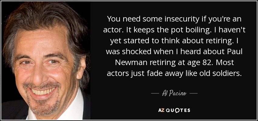 You need some insecurity if you're an actor. It keeps the pot boiling. I haven't yet started to think about retiring. I was shocked when I heard about Paul Newman retiring at age 82. Most actors just fade away like old soldiers.
