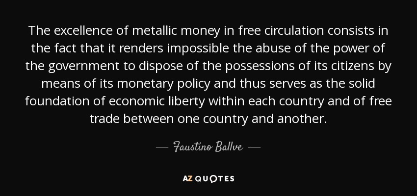 The excellence of metallic money in free circulation consists in the fact that it renders impossible the abuse of the power of the government to dispose of the possessions of its citizens by means of its monetary policy and thus serves as the solid foundation of economic liberty within each country and of free trade between one country and another.