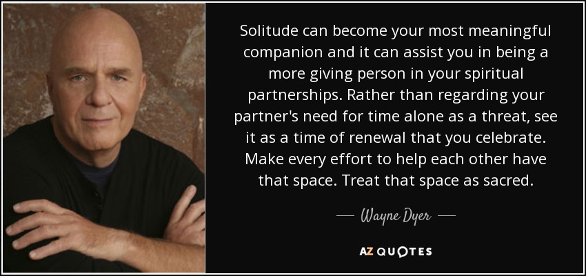 Solitude can become your most meaningful companion and it can assist you in being a more giving person in your spiritual partnerships. Rather than regarding your partner's need for time alone as a threat, see it as a time of renewal that you celebrate. Make every effort to help each other have that space. Treat that space as sacred.