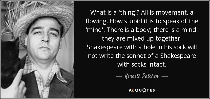 What is a 'thing'? All is movement, a flowing. How stupid it is to speak of the 'mind'. There is a body; there is a mind: they are mixed up together. Shakespeare with a hole in his sock will not write the sonnet of a Shakespeare with socks intact.