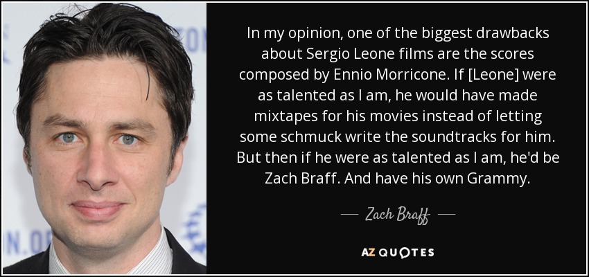 In my opinion, one of the biggest drawbacks about Sergio Leone films are the scores composed by Ennio Morricone. If [Leone] were as talented as I am, he would have made mixtapes for his movies instead of letting some schmuck write the soundtracks for him. But then if he were as talented as I am, he'd be Zach Braff. And have his own Grammy.