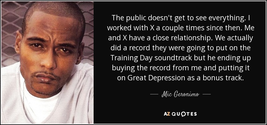 The public doesn't get to see everything. I worked with X a couple times since then. Me and X have a close relationship. We actually did a record they were going to put on the Training Day soundtrack but he ending up buying the record from me and putting it on Great Depression as a bonus track.