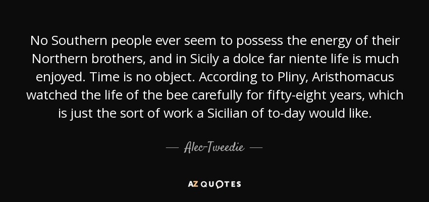 No Southern people ever seem to possess the energy of their Northern brothers, and in Sicily a dolce far niente life is much enjoyed. Time is no object. According to Pliny, Aristhomacus watched the life of the bee carefully for fifty-eight years, which is just the sort of work a Sicilian of to-day would like.
