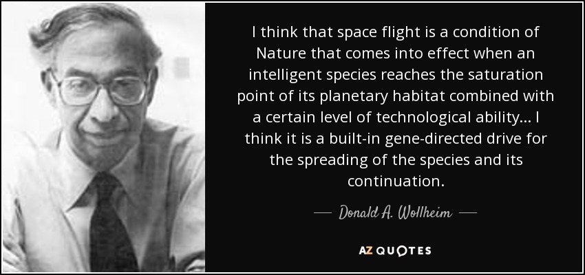 I think that space flight is a condition of Nature that comes into effect when an intelligent species reaches the saturation point of its planetary habitat combined with a certain level of technological ability... I think it is a built-in gene-directed drive for the spreading of the species and its continuation.