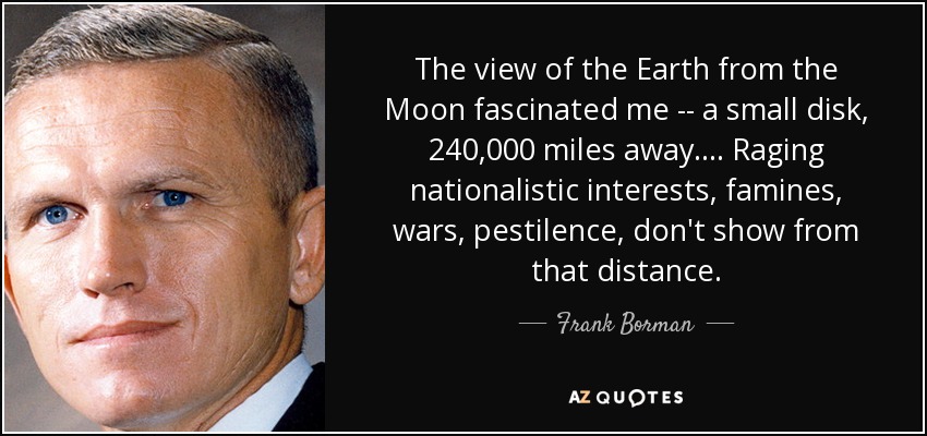 The view of the Earth from the Moon fascinated me -- a small disk, 240,000 miles away. . . . Raging nationalistic interests, famines, wars, pestilence, don't show from that distance.