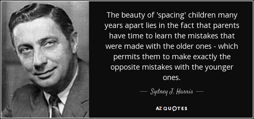 The beauty of 'spacing' children many years apart lies in the fact that parents have time to learn the mistakes that were made with the older ones - which permits them to make exactly the opposite mistakes with the younger ones.