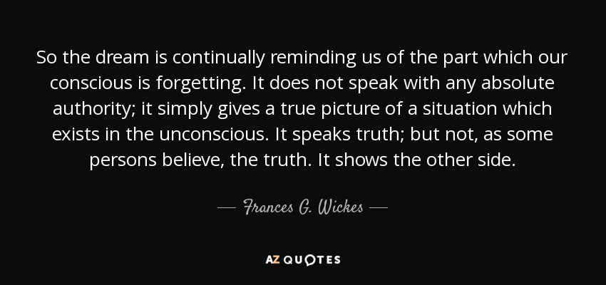 So the dream is continually reminding us of the part which our conscious is forgetting. It does not speak with any absolute authority; it simply gives a true picture of a situation which exists in the unconscious. It speaks truth; but not, as some persons believe, the truth. It shows the other side.