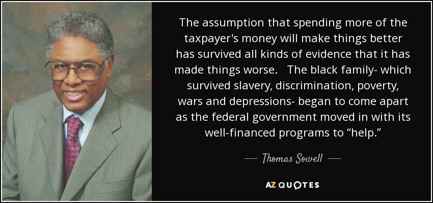 The assumption that spending more of the taxpayer's money will make things better has survived all kinds of evidence that it has made things worse. The black family- which survived slavery, discrimination, poverty, wars and depressions- began to come apart as the federal government moved in with its well-financed programs to “help.”