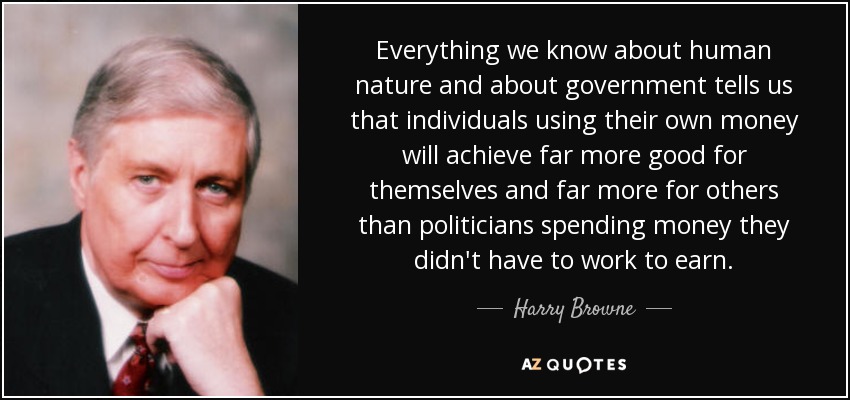 Everything we know about human nature and about government tells us that individuals using their own money will achieve far more good for themselves and far more for others than politicians spending money they didn't have to work to earn.