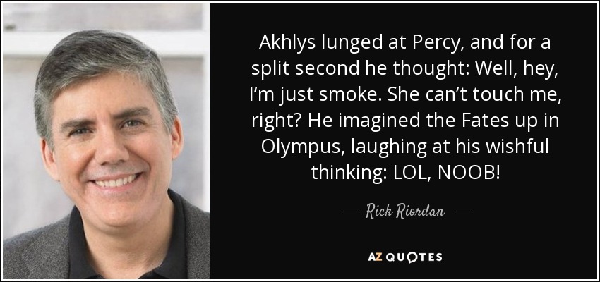 Akhlys lunged at Percy, and for a split second he thought: Well, hey, I’m just smoke. She can’t touch me, right? He imagined the Fates up in Olympus, laughing at his wishful thinking: LOL, NOOB!