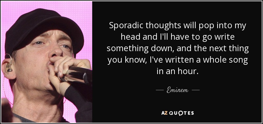 Sporadic thoughts will pop into my head and I'll have to go write something down, and the next thing you know, I've written a whole song in an hour.