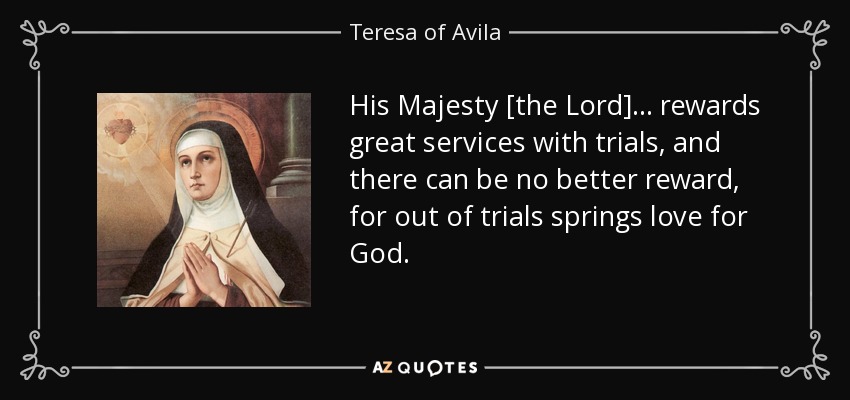 His Majesty [the Lord] . . . rewards great services with trials, and there can be no better reward, for out of trials springs love for God.