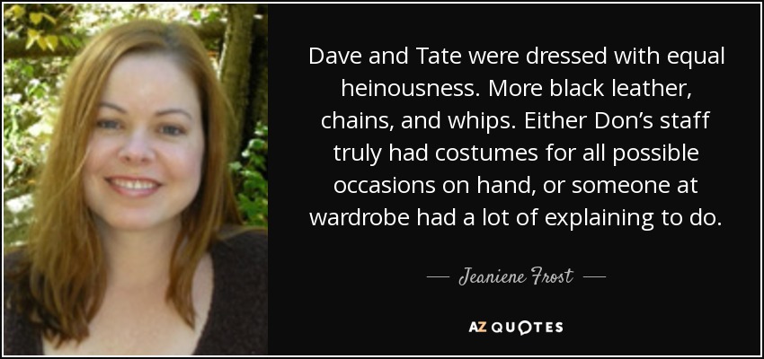 Dave and Tate were dressed with equal heinousness. More black leather, chains, and whips. Either Don’s staff truly had costumes for all possible occasions on hand, or someone at wardrobe had a lot of explaining to do.