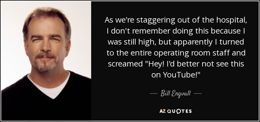 As we're staggering out of the hospital, I don't remember doing this because I was still high, but apparently I turned to the entire operating room staff and screamed "Hey! I'd better not see this on YouTube!"
