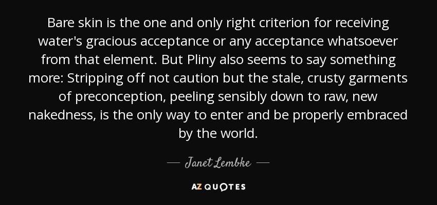 Bare skin is the one and only right criterion for receiving water's gracious acceptance or any acceptance whatsoever from that element. But Pliny also seems to say something more: Stripping off not caution but the stale, crusty garments of preconception, peeling sensibly down to raw, new nakedness, is the only way to enter and be properly embraced by the world.