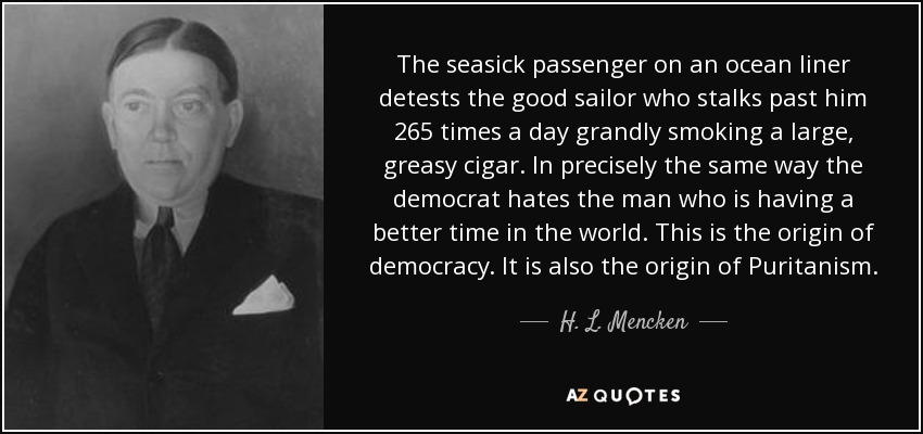 The seasick passenger on an ocean liner detests the good sailor who stalks past him 265 times a day grandly smoking a large, greasy cigar. In precisely the same way the democrat hates the man who is having a better time in the world. This is the origin of democracy. It is also the origin of Puritanism.