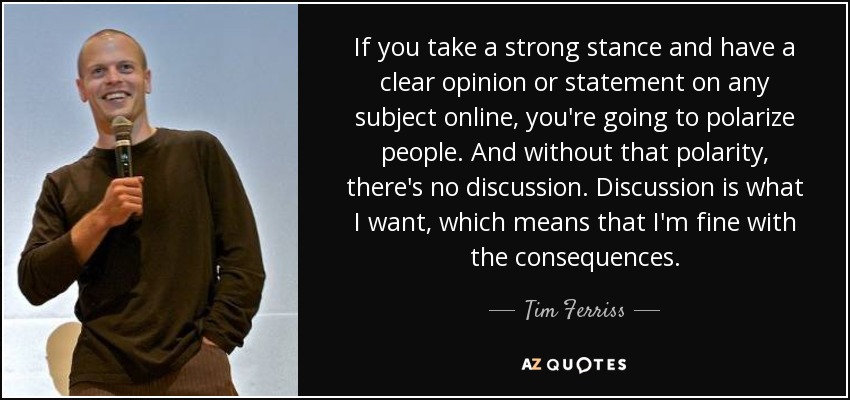 If you take a strong stance and have a clear opinion or statement on any subject online, you're going to polarize people. And without that polarity, there's no discussion. Discussion is what I want, which means that I'm fine with the consequences.