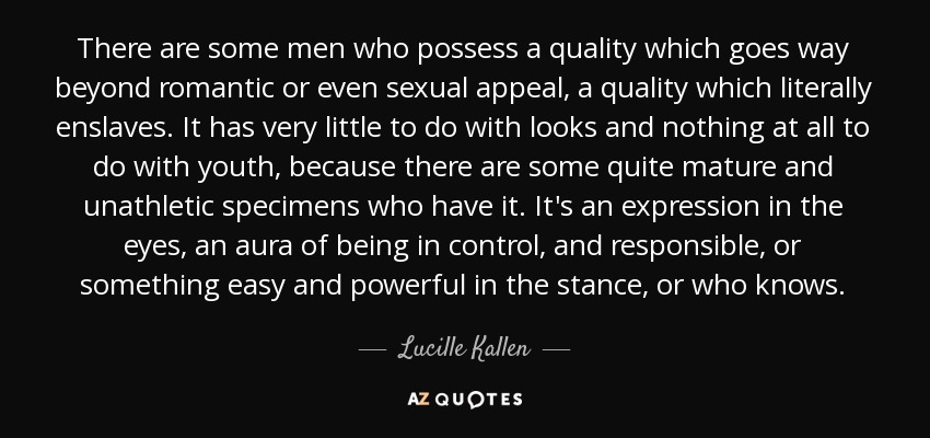 There are some men who possess a quality which goes way beyond romantic or even sexual appeal, a quality which literally enslaves. It has very little to do with looks and nothing at all to do with youth, because there are some quite mature and unathletic specimens who have it. It's an expression in the eyes, an aura of being in control, and responsible, or something easy and powerful in the stance, or who knows.