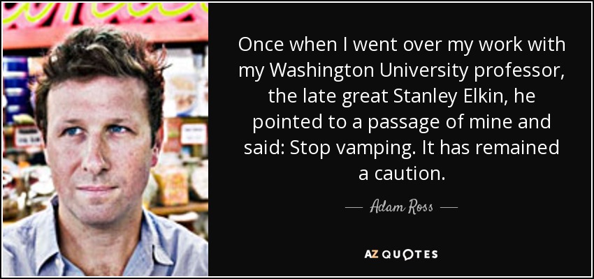 Once when I went over my work with my Washington University professor, the late great Stanley Elkin, he pointed to a passage of mine and said: Stop vamping. It has remained a caution.