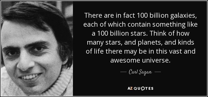 There are in fact 100 billion galaxies, each of which contain something like a 100 billion stars. Think of how many stars, and planets, and kinds of life there may be in this vast and awesome universe.