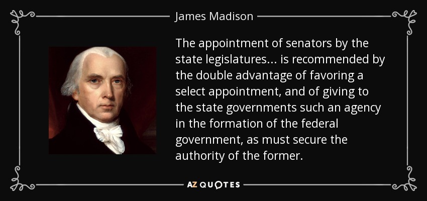 The appointment of senators by the state legislatures . . . is recommended by the double advantage of favoring a select appointment, and of giving to the state governments such an agency in the formation of the federal government, as must secure the authority of the former.