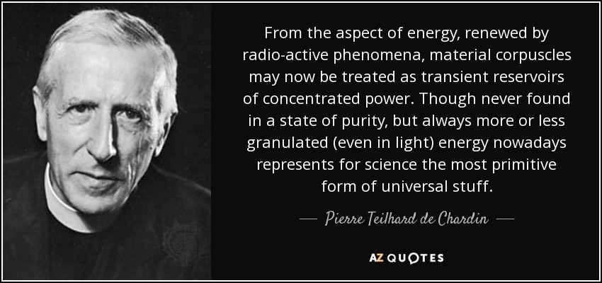 From the aspect of energy, renewed by radio-active phenomena, material corpuscles may now be treated as transient reservoirs of concentrated power. Though never found in a state of purity, but always more or less granulated (even in light) energy nowadays represents for science the most primitive form of universal stuff.