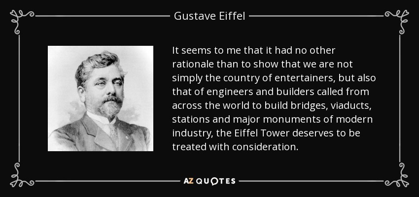 It seems to me that it had no other rationale than to show that we are not simply the country of entertainers, but also that of engineers and builders called from across the world to build bridges, viaducts, stations and major monuments of modern industry, the Eiffel Tower deserves to be treated with consideration.