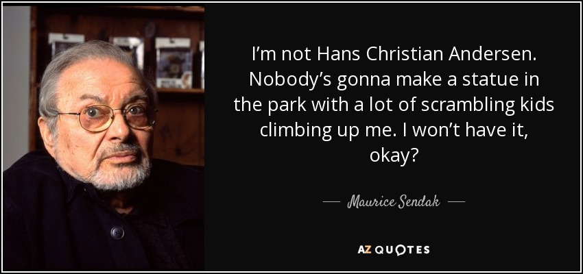 I’m not Hans Christian Andersen. Nobody’s gonna make a statue in the park with a lot of scrambling kids climbing up me. I won’t have it, okay?