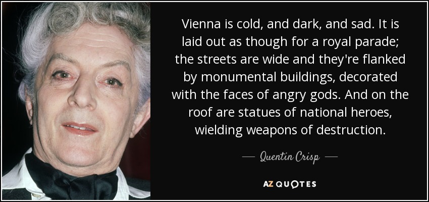 Vienna is cold, and dark, and sad. It is laid out as though for a royal parade; the streets are wide and they're flanked by monumental buildings, decorated with the faces of angry gods. And on the roof are statues of national heroes, wielding weapons of destruction.