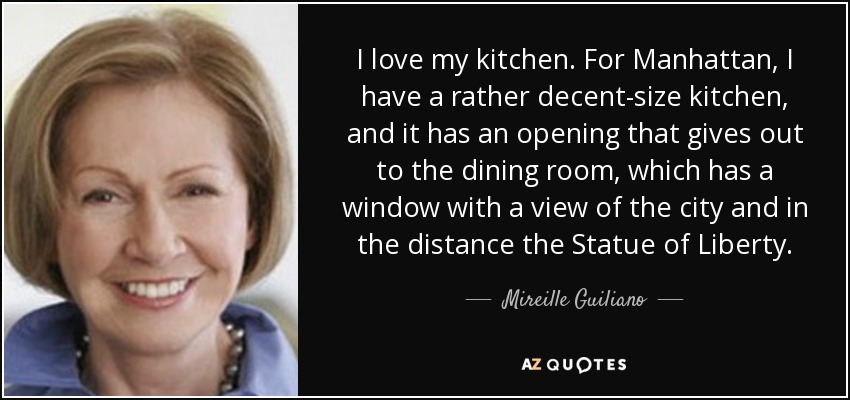 I love my kitchen. For Manhattan, I have a rather decent-size kitchen, and it has an opening that gives out to the dining room, which has a window with a view of the city and in the distance the Statue of Liberty.
