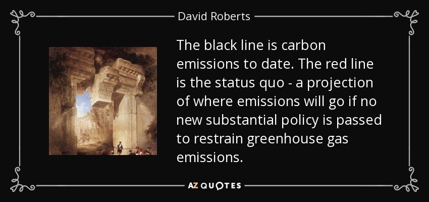 The black line is carbon emissions to date. The red line is the status quo - a projection of where emissions will go if no new substantial policy is passed to restrain greenhouse gas emissions.