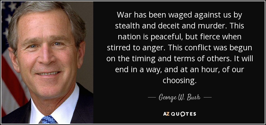 War has been waged against us by stealth and deceit and murder. This nation is peaceful, but fierce when stirred to anger. This conflict was begun on the timing and terms of others. It will end in a way, and at an hour, of our choosing.