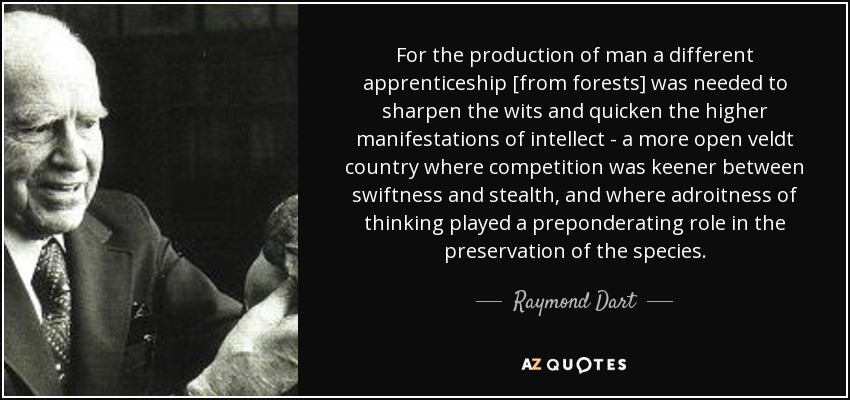 For the production of man a different apprenticeship [from forests] was needed to sharpen the wits and quicken the higher manifestations of intellect - a more open veldt country where competition was keener between swiftness and stealth, and where adroitness of thinking played a preponderating role in the preservation of the species.