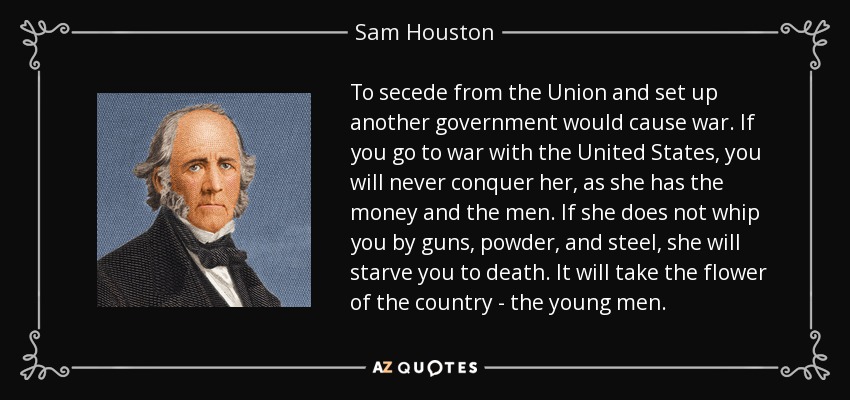 To secede from the Union and set up another government would cause war. If you go to war with the United States, you will never conquer her, as she has the money and the men. If she does not whip you by guns, powder, and steel, she will starve you to death. It will take the flower of the country - the young men.