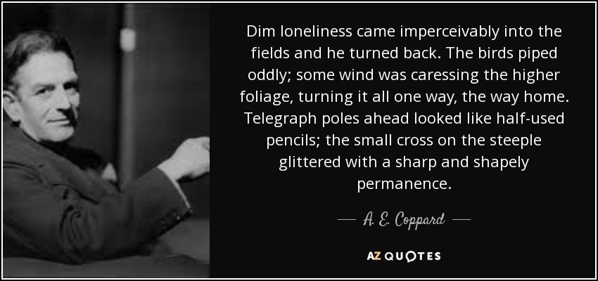 Dim loneliness came imperceivably into the fields and he turned back. The birds piped oddly; some wind was caressing the higher foliage, turning it all one way, the way home. Telegraph poles ahead looked like half-used pencils; the small cross on the steeple glittered with a sharp and shapely permanence.