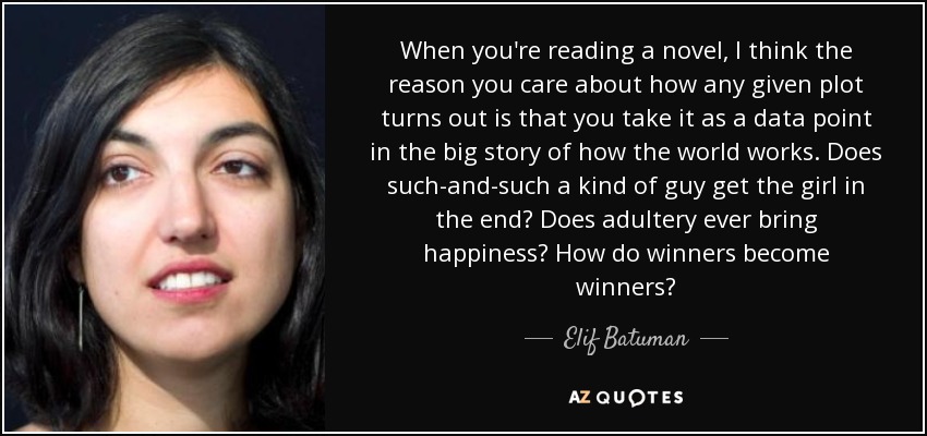 When you're reading a novel, I think the reason you care about how any given plot turns out is that you take it as a data point in the big story of how the world works. Does such-and-such a kind of guy get the girl in the end? Does adultery ever bring happiness? How do winners become winners?