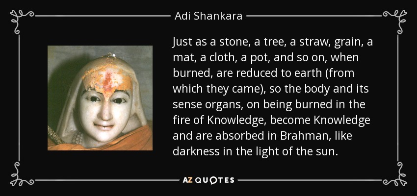 Just as a stone, a tree, a straw, grain, a mat, a cloth, a pot, and so on, when burned, are reduced to earth (from which they came), so the body and its sense organs, on being burned in the fire of Knowledge, become Knowledge and are absorbed in Brahman, like darkness in the light of the sun.