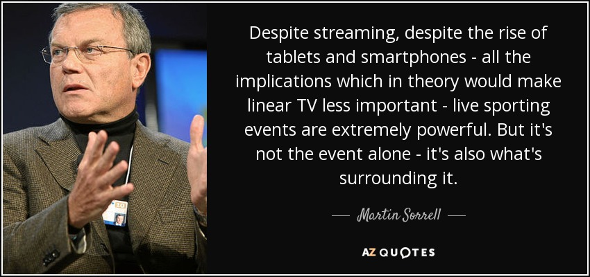 Despite streaming, despite the rise of tablets and smartphones - all the implications which in theory would make linear TV less important - live sporting events are extremely powerful. But it's not the event alone - it's also what's surrounding it.