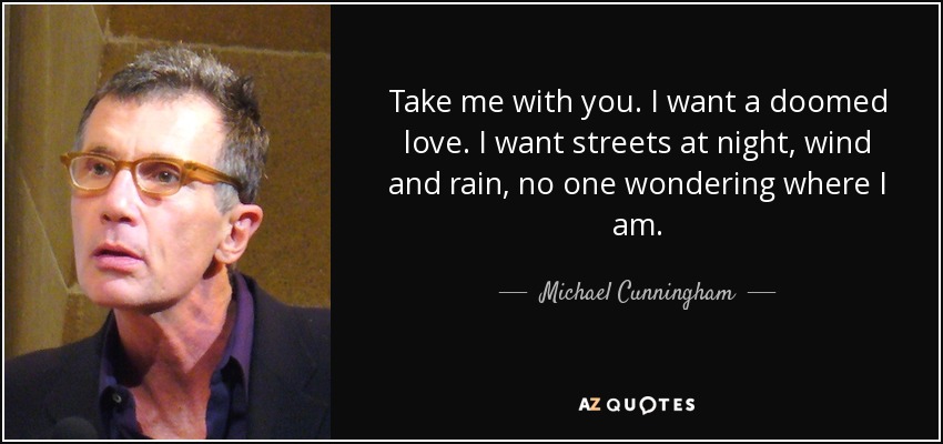 Take me with you. I want a doomed love. I want streets at night, wind and rain, no one wondering where I am.