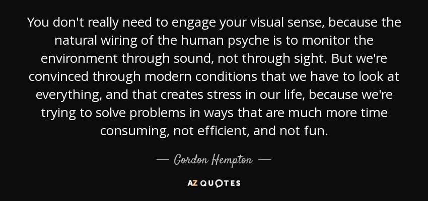 You don't really need to engage your visual sense, because the natural wiring of the human psyche is to monitor the environment through sound, not through sight. But we're convinced through modern conditions that we have to look at everything, and that creates stress in our life, because we're trying to solve problems in ways that are much more time consuming, not efficient, and not fun.