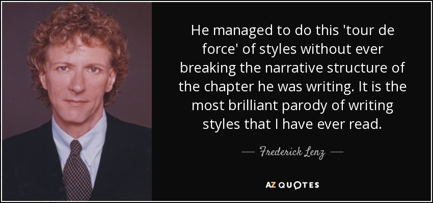He managed to do this 'tour de force' of styles without ever breaking the narrative structure of the chapter he was writing. It is the most brilliant parody of writing styles that I have ever read.